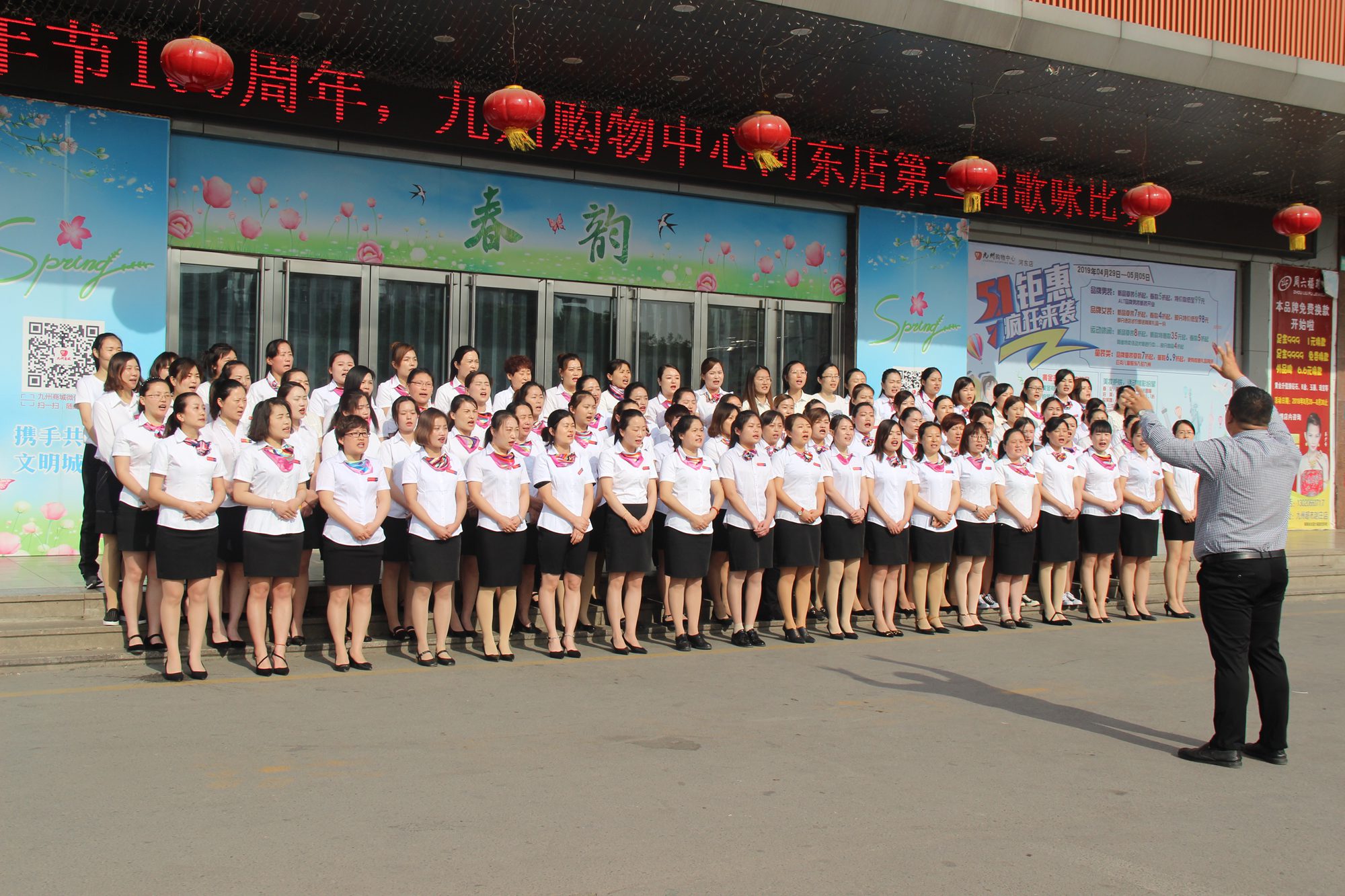 5月4日上午,購(gòu)物中心河?xùn)|店在門前廣場(chǎng)舉辦第三屆歌詠比賽。500多張充滿朝氣的面孔通過(guò)歌唱紅色經(jīng)典這種獨(dú)特的方式,慶祝“五四”青年節(jié)。