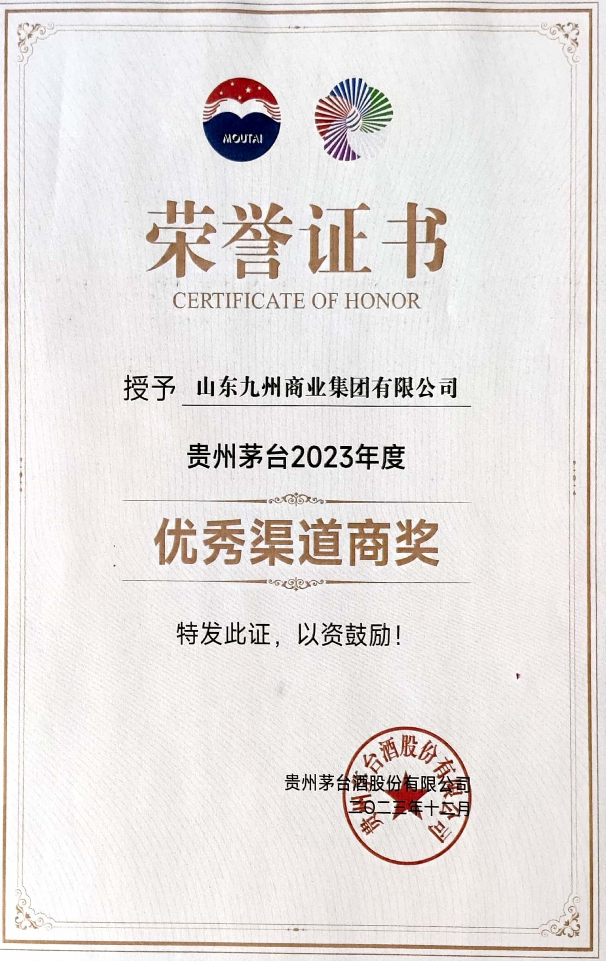 2023年12月31日,貴州茅臺酒市場工作會在三亞召開。會上對在2023年茅臺營銷工作中表現(xiàn)優(yōu)秀的單位及個人進行了表彰。山東九州商業(yè)集團有限公司榮獲“貴州茅臺2023年度優(yōu)秀渠道商獎”。