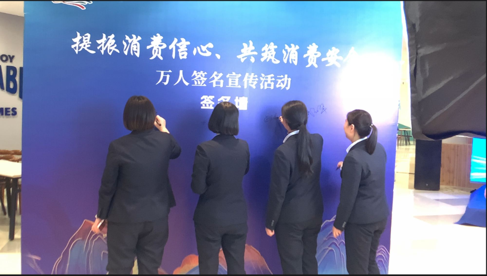 活動中,九州商業(yè)大廈解放路店組織員工代表在六樓商場觀看了主會場的宣傳活動情況,同時(shí)連線主會場進(jìn)行集體承諾發(fā)言,活動結(jié)束后大家移步到簽名墻進(jìn)行簽名。