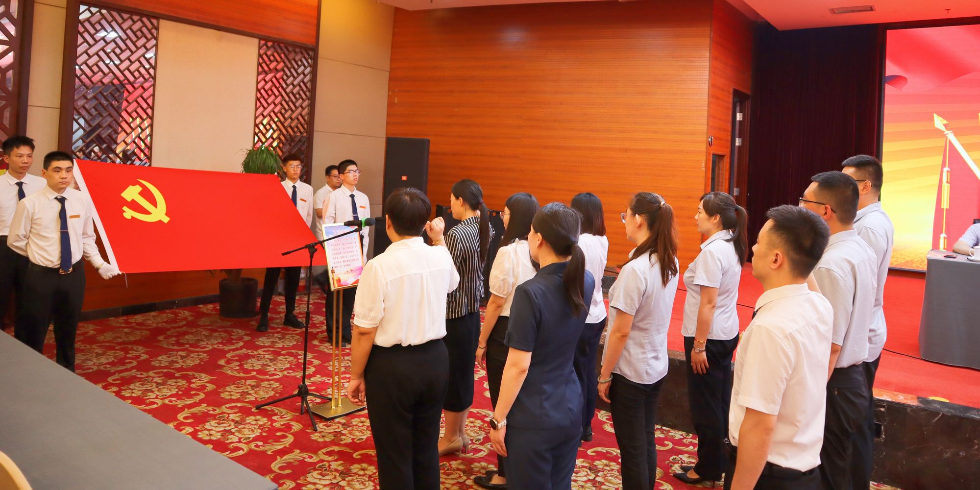 會議在雄壯激昂的國歌聲中拉開帷幕。會上,舉行了新發(fā)展黨員入黨宣誓儀式。集團黨委副書記、紀委書記王姣帶領(lǐng)集團新發(fā)展的9名黨員面向黨旗莊嚴宣誓。