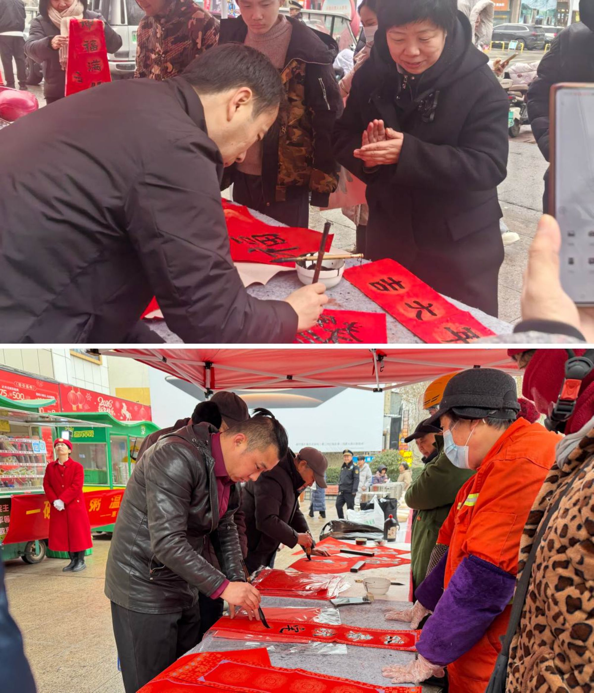 在活動(dòng)現(xiàn)場(chǎng),一杯杯熱呼香甜的臘八粥送到環(huán)衛(wèi)工人和廣大市民手中,大家喝著熱騰騰的粥,圍在書案前欣賞著書法老師篆寫的春聯(lián)和福字,當(dāng)一幅幅福氣年味拉滿的春聯(lián)和福字送到廣大市民手中,人人臉上洋溢著燦爛的笑顏。