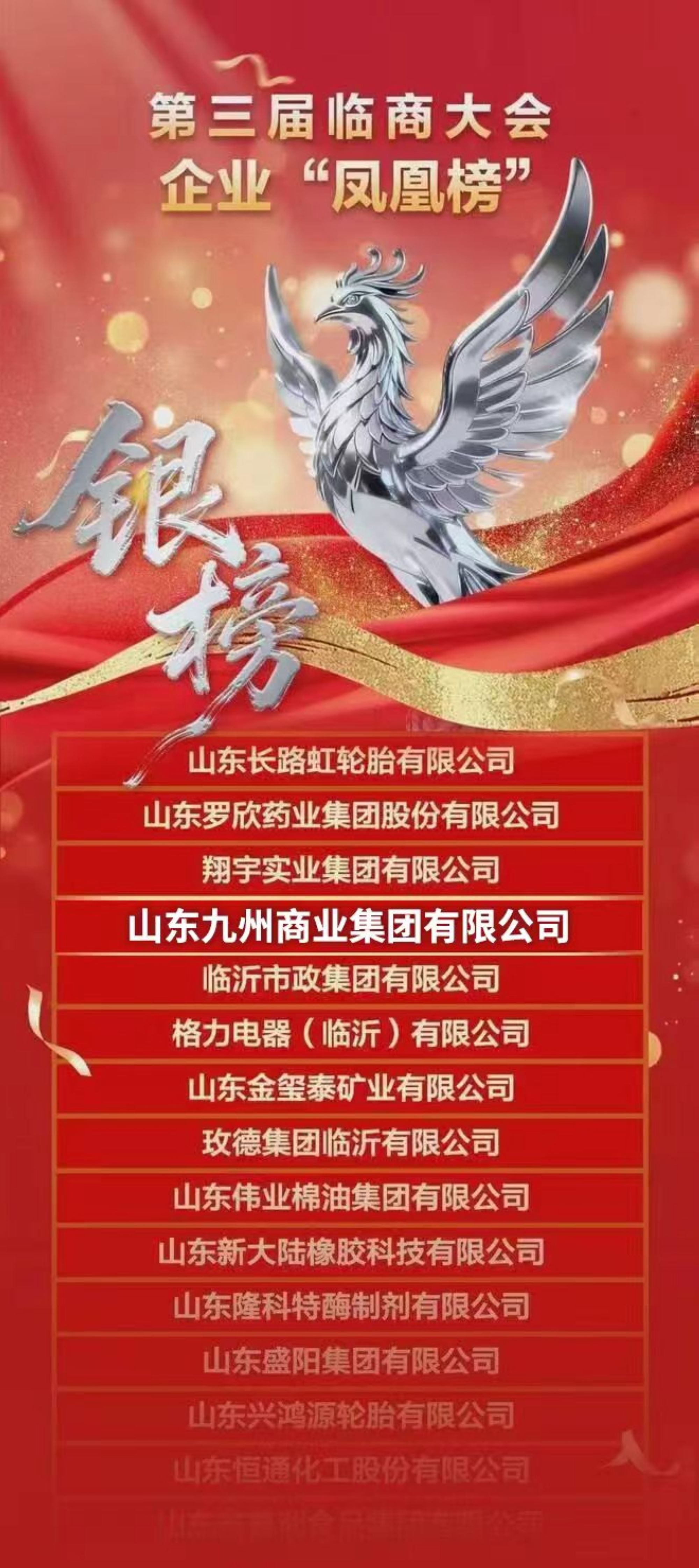 大會(huì)發(fā)布了臨沂市企業(yè)“鳳凰榜”,九州集團(tuán)再度榮登“鳳凰銀榜”。