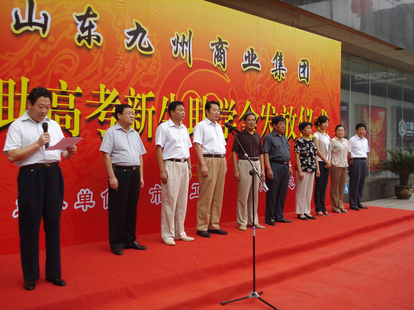 (儀式結(jié)束后領(lǐng)導(dǎo)與受助大學(xué)生合影留念) 8月25日上午,集團在九州商業(yè)大廈前舉行山東九州商業(yè)集團資助高考新生助學(xué)金發(fā)放儀式。50名受助大學(xué)生每人獲得了3000元的九州商業(yè)集團助學(xué)金。市總工會黨組副書記、副主席王向群,市總工會黨組成員、副調(diào)研員張濤,市民政局副局長、市慈善總會副會長兼秘書長朱步君,市總工會生產(chǎn)保障部部長王秀麗,臨沂市城市形象大使姚宇,以及集團領(lǐng)導(dǎo)楊本渠、張素芬、楊沂城、王佐文等同志參加助學(xué)金發(fā)放儀式。 集團總經(jīng)理楊沂城、市總工會副主席王向群、受助大學(xué)生代表、受助大學(xué)生家長代表分別在儀式上講話。楊總在講話中表示,企業(yè)在自身不斷發(fā)展的同時,牢記報效國家、回饋社會、積極投身公益的使命,勇于承擔(dān)社會責(zé)任,熱心支持慈善事業(yè)。多年來集團積極參與各類助學(xué)、助殘、救災(zāi)、濟困等公益活動,累計捐款捐物達數(shù)百萬元,受到社會各界的一致好評。楊總說,大學(xué)生是國家寶貴的人才資源,是民族的希望、祖國的未來,肩負著全面建設(shè)小康社會、努力構(gòu)建和諧社會、實現(xiàn)中華民族偉大復(fù)興的歷史重任。楊總勉勵受助的大學(xué)生珍惜大學(xué)的美好時光,樹立遠大理想,努力學(xué)習(xí)文化知識,以知識改變命運,用優(yōu)異的成績、過硬的本領(lǐng)奉獻社會、報效祖國、建設(shè)家鄉(xiāng)。 市總工會副主席王向群在講話中首先向楊本渠董事長及九州商業(yè)集團多年來積極獻身公益事業(yè)表示了感謝。他勉勵受助的大學(xué)生珍惜大學(xué)生活,不忘社會各界的幫助,努力學(xué)習(xí),回報社會。他希望更多的企業(yè)投身到社會慈善事業(yè)中來,讓更多的弱勢群體享受到祖國大家庭的溫暖。