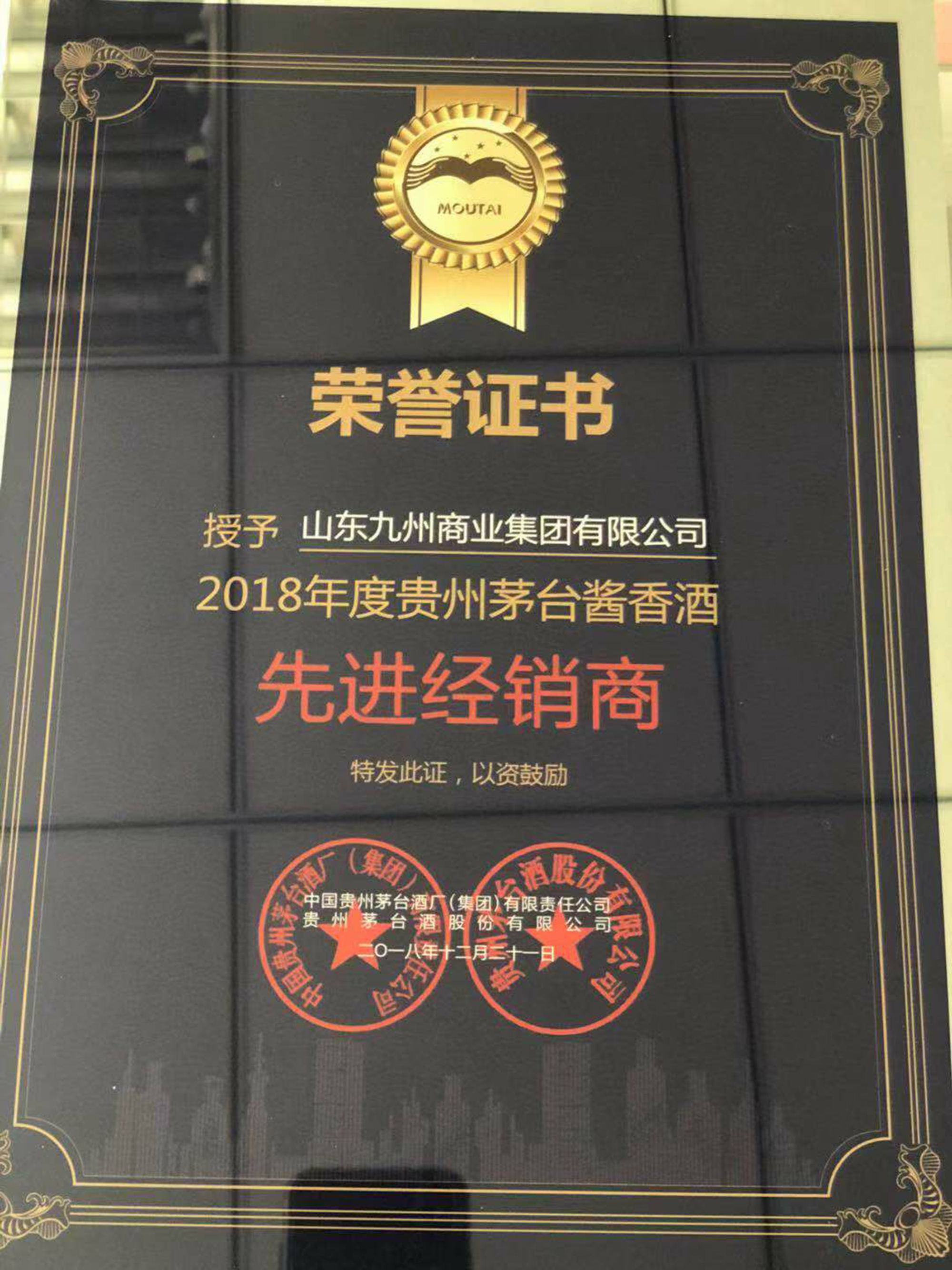 12月21日,2018年度貴州茅臺(tái)醬香酒全國(guó)經(jīng)銷商大會(huì)在遵義召開,九州集團(tuán)作為經(jīng)銷商參加了此次會(huì)議。會(huì)上,九州集團(tuán)被中國(guó)貴州茅臺(tái)酒廠(集團(tuán))有限責(zé)任公司、貴州茅臺(tái)酒股份有限公司授予 “2018年度貴州茅臺(tái)醬香酒先進(jìn)經(jīng)銷商”榮譽(yù)稱號(hào)。(超市公司 周瑤)