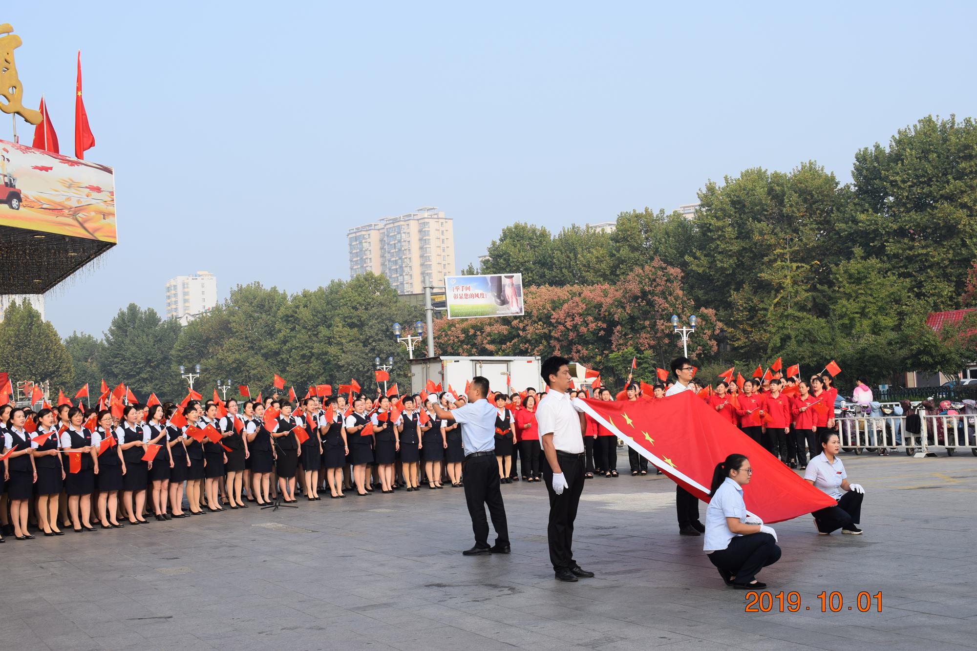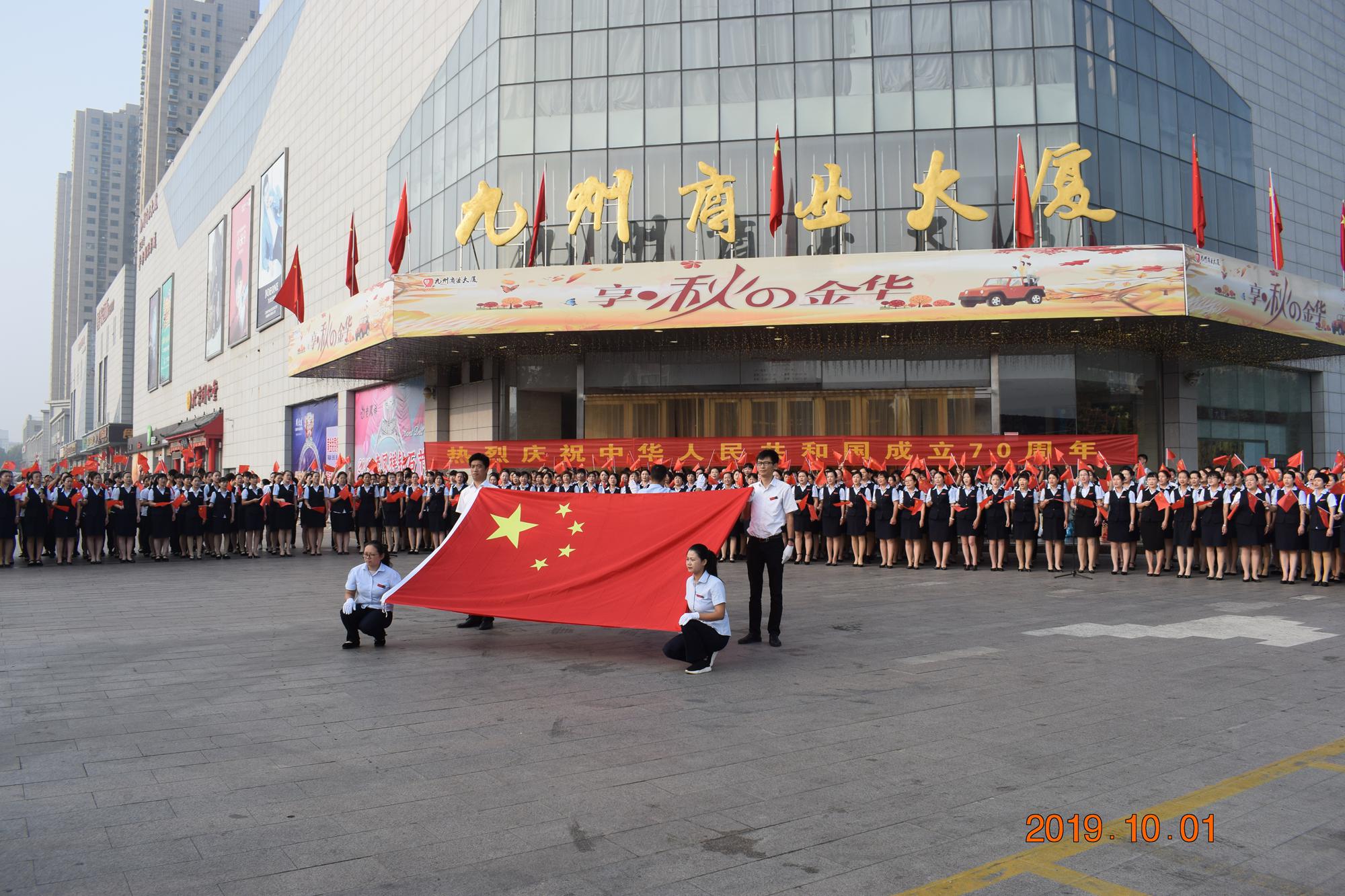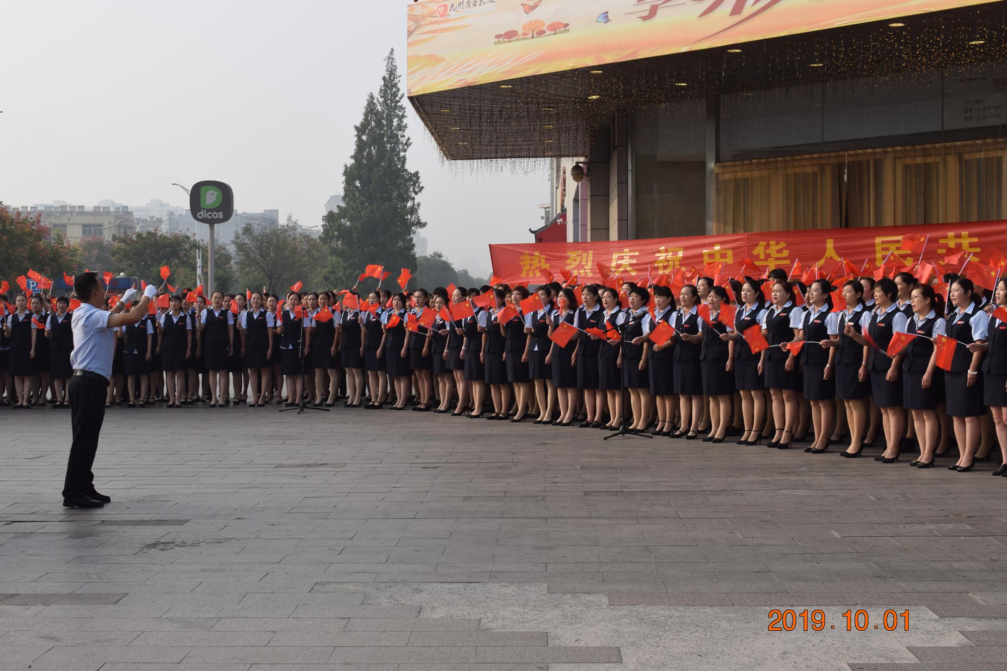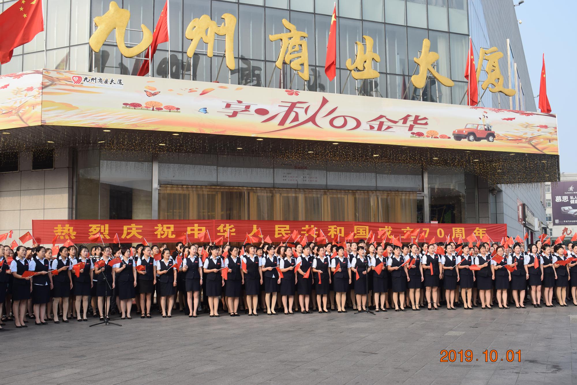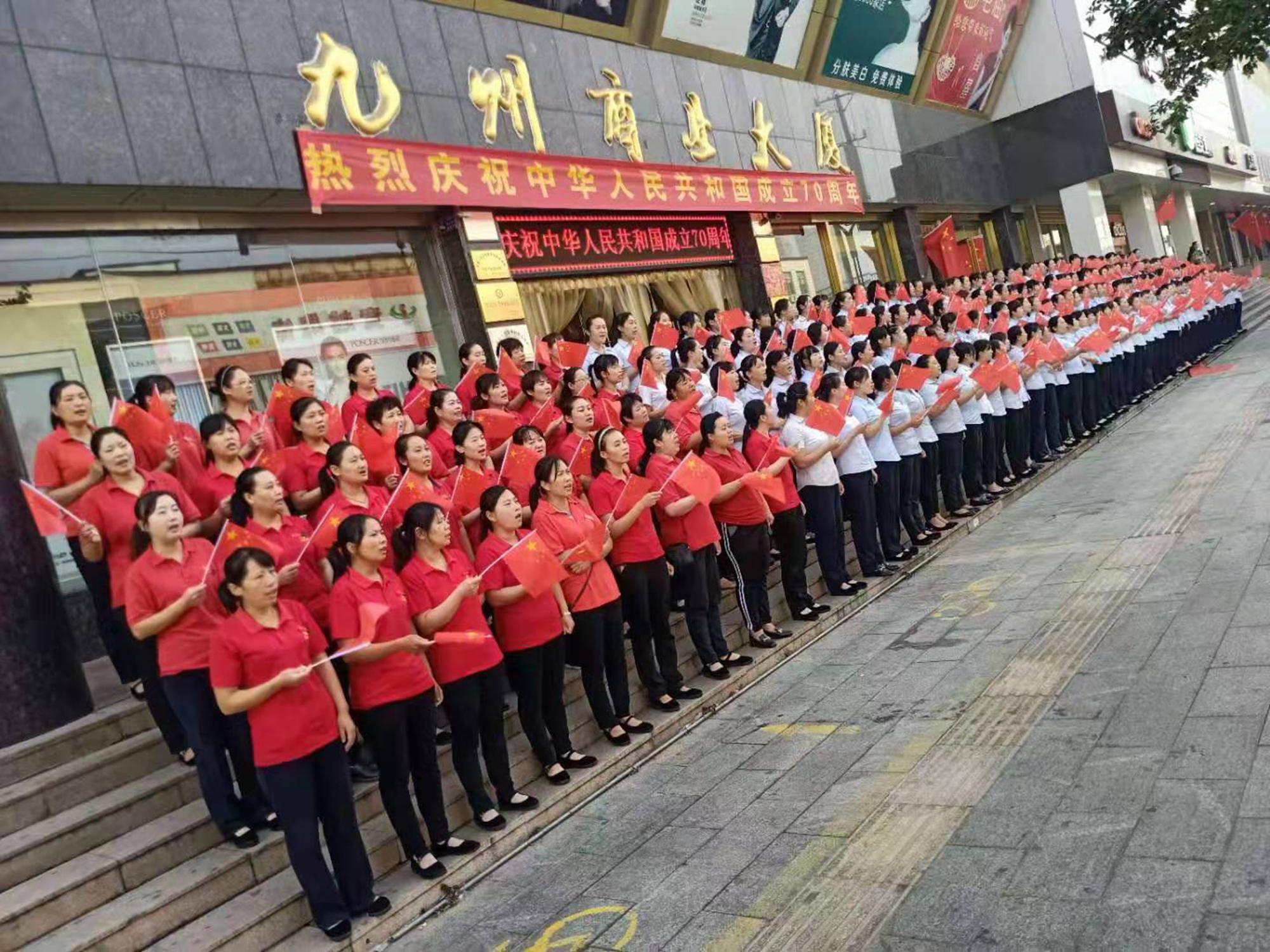 10月1日上午,九州商業(yè)大廈沂水區(qū)域門店分別在各店門前廣場舉行了慶國慶合唱活動。先后合唱了《我和我的祖國》、《九州集團之歌》等歌曲。