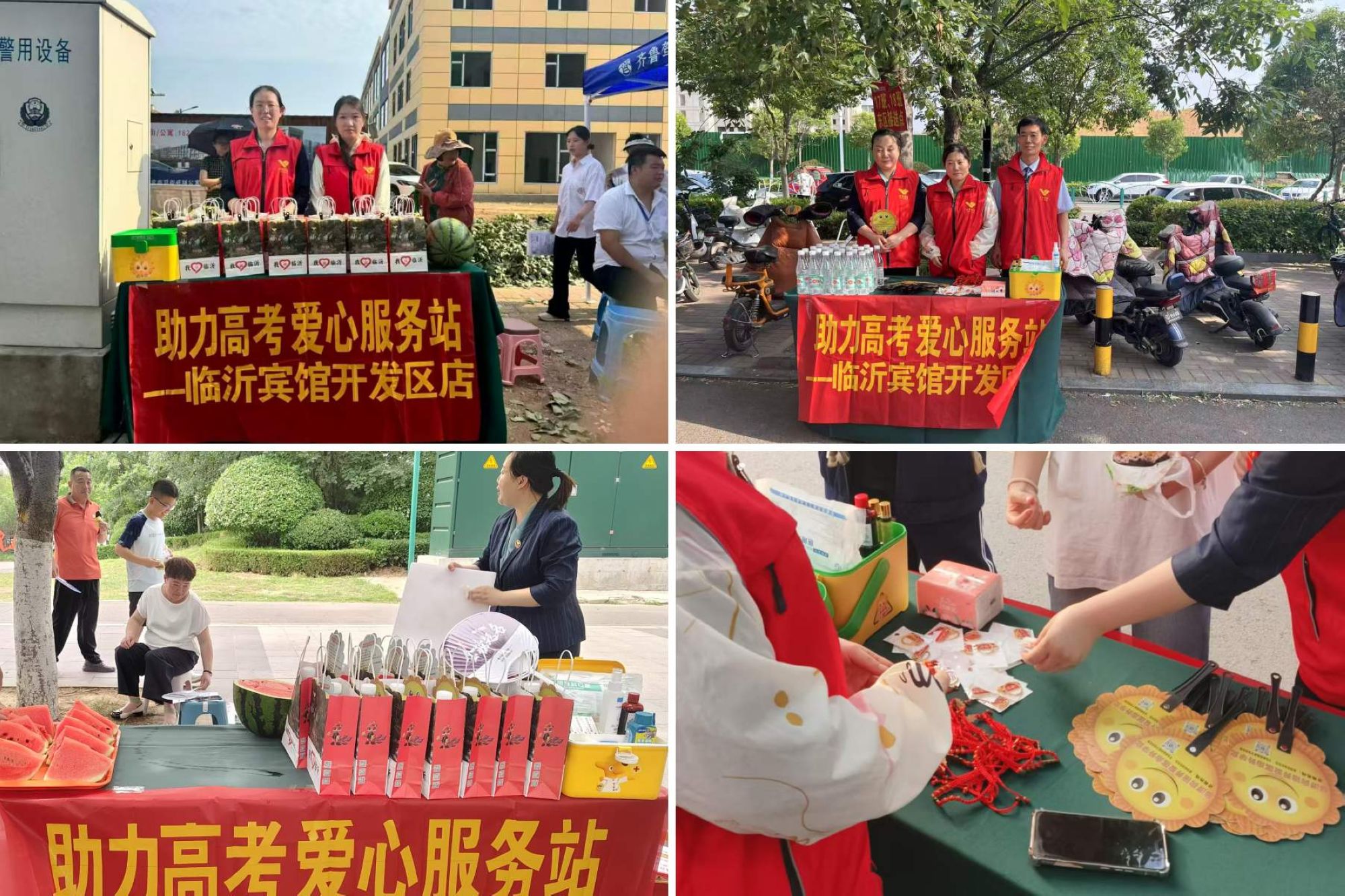 開發(fā)區(qū)店在臨沂二十四中、臨沂外國語學校考點外搭建高考愛心服務站,為考生及家長免費提供飲用水、應急醫(yī)藥箱、清涼小扇子及定制版“金榜題名”手鏈與鑰匙扣。