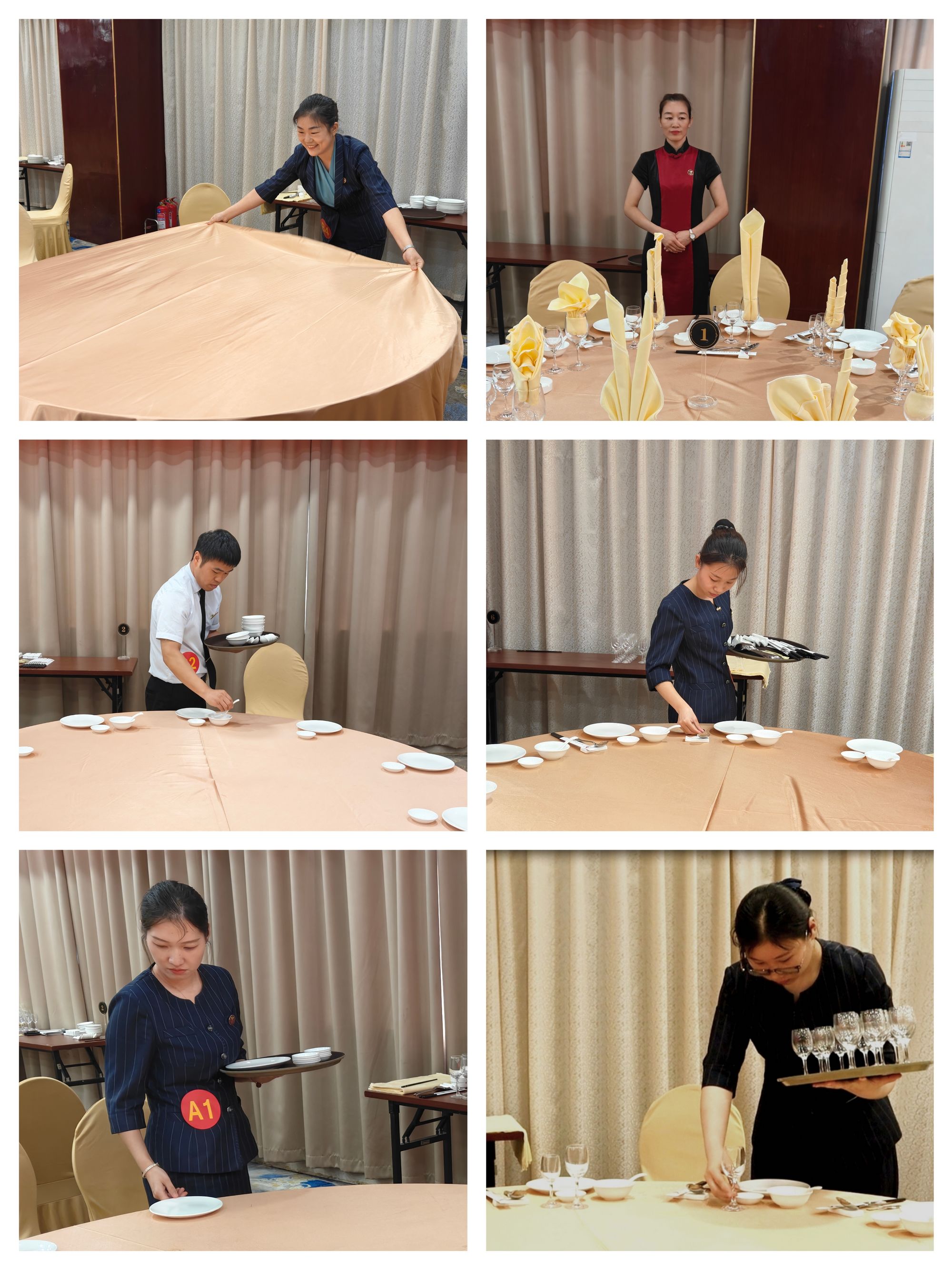 本次技能比武項(xiàng)目為餐廳中餐宴會(huì)擺臺(tái),比賽分為員工組和基層管理人員組,現(xiàn)場抽簽決定參賽順序。賽場上,選手們?nèi)褙炞,在?guī)定的時(shí)間內(nèi),憑借自己的專業(yè)技能,將一張張普通的餐桌布置成既美觀又實(shí)用的用餐環(huán)境。鋪?zhàn)啦紩r(shí)行云流水,定位餐具時(shí)快速均,餐巾折花綻放栩栩如生的造型,每一個(gè)細(xì)節(jié)都彰顯著選手們?cè)鷮?shí)的功底與精益求精的技藝。經(jīng)過評(píng)委綜合評(píng)比,開發(fā)區(qū)店餐廳部薛會(huì)娜和陳彩霞分獲基層管理人員組和員工組第一名;宗龍星、丁朝陽分獲基層管理人員組第二、第三名,付振云、房桂宇分獲員工組第二、第三名。