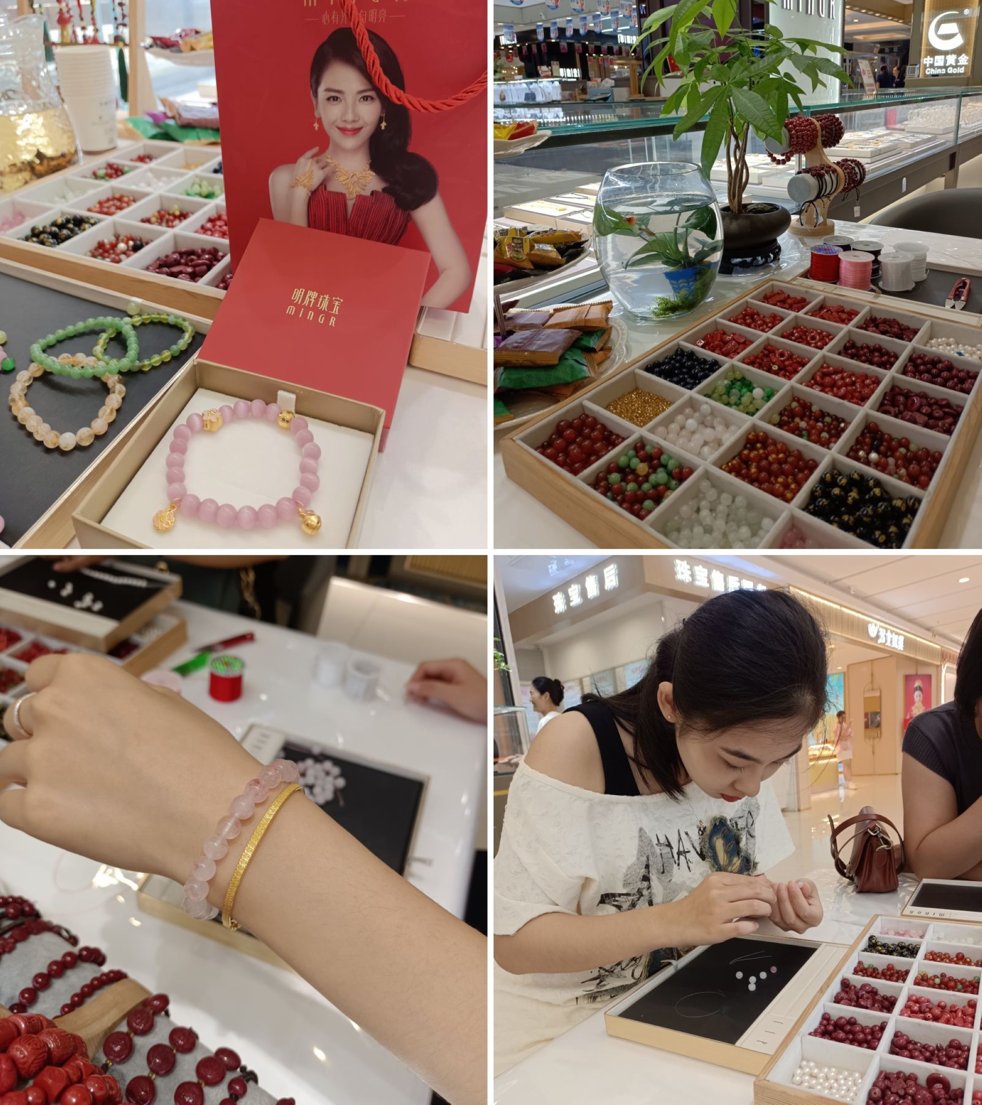 活動(dòng)現(xiàn)場(chǎng),專(zhuān)柜備有多樣串珠材料,顧客可按照喜好將串珠與黃金飾品巧妙搭配,碰撞出獨(dú)有的風(fēng)格。一件件獨(dú)具巧妙的作品完成后,顧客們紛紛拍照分享,對(duì)自己親手制作的作品愛(ài)不釋手。