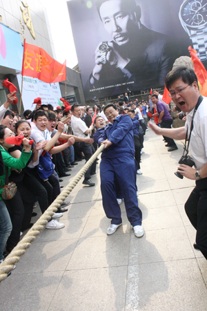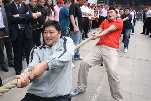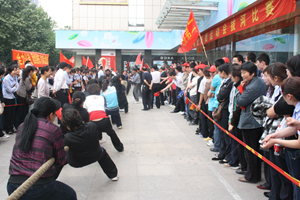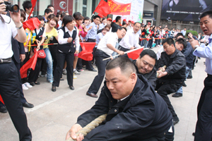 5月16日,“和諧九州”拔河比賽在九州大廈門(mén)前廣場(chǎng)舉行,九州商業(yè)大廈、臨沂賓館、九州連鎖超市公司、九州宜家佳、九州汽車銷售公司、集團(tuán)行政等六支代表隊(duì)參加比賽。